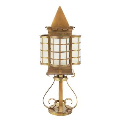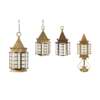 each with prism pediments with castellated decoration above four bowed frosted glass panels, comprising a LARGE LANTERN, 47cm high; and a PAIR OF SMALLER LANTERNS, each 33cm high; together with a MATCHING NEWEL POST LIGHT, of corresponding design with scrolling base, 46cm high (excluding fitting)