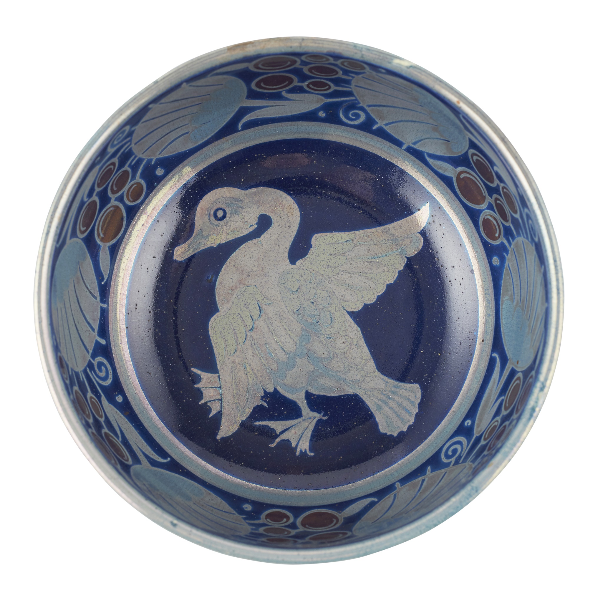 decorated by Fred Passenger in blue and red glazes, the interior decorated with a goose within repeating pattern of berries and seed heads, with stylised foliage to the exterior, painted initials F. P.