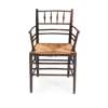 with spindle filled back, open arms and rush seat, raised on turned legs linked by stretchers