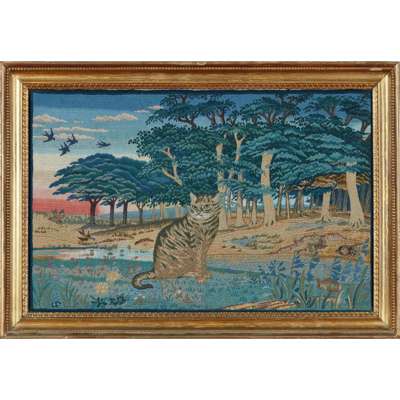 Included in the group was the design for the present lot, a watercolour study depicting a tabby cat sitting in a wooded landscape (see illustration), detailed with graphite and black chalk. When comparing the finished embroidery to the study almost every detail, from the swallows in the sky, the positioning of the trees, to the rabbits in the right-hand corner, correspond with the finished piece. There are also further studies of a tabby cat within the collection, including an example drawn on a brown envelope, with a corrected design of the head facing forward rather than to the side, pasted on top of the drawing.