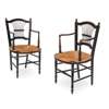 each with waisted spindle backs, the open arms above circular rush seats, raised on turned legs linked by stretchers