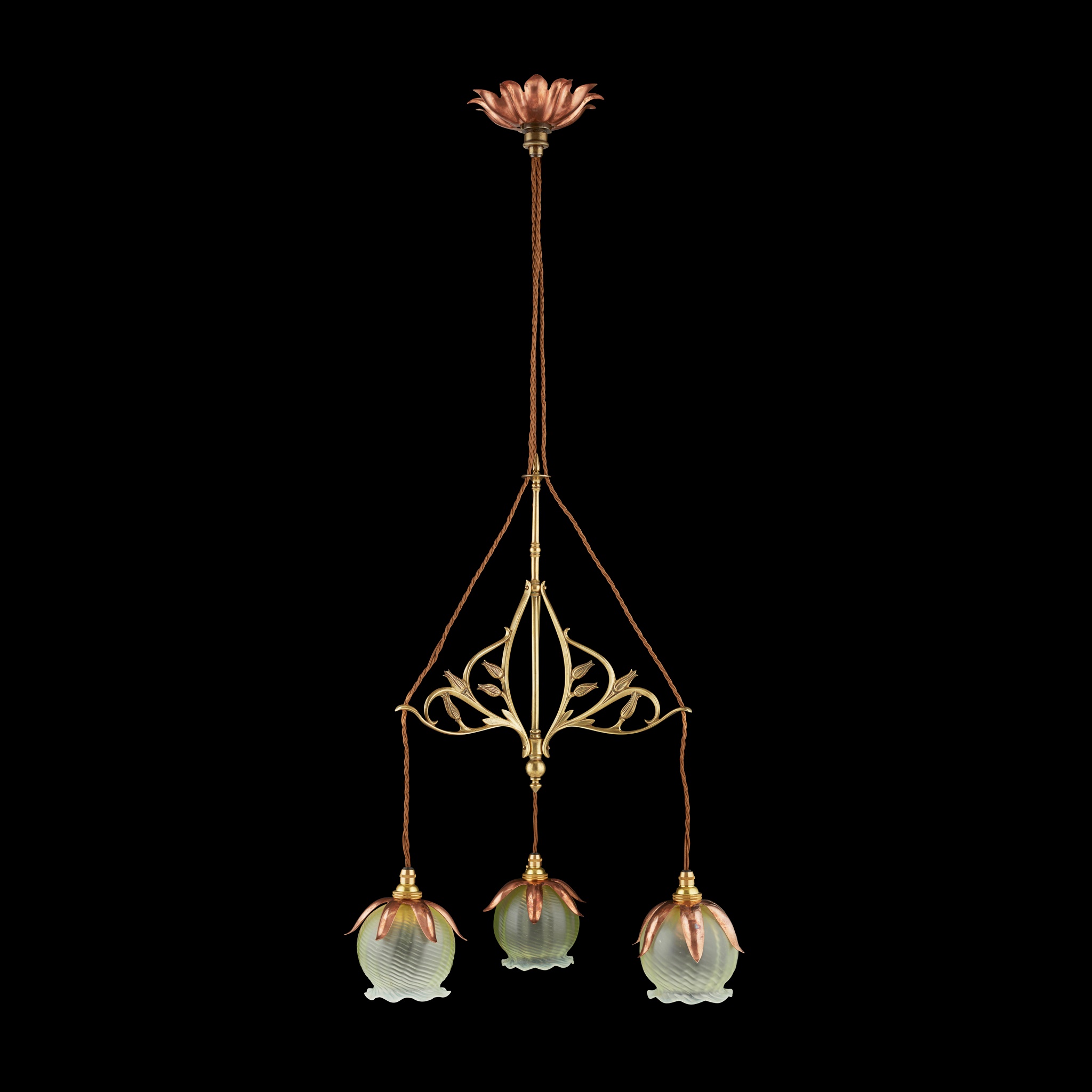 model 1093, the embossed ceiling rose above three branches, each cast with leafy boughs and suspending light fittings with Vaseline glass shades, stamped maker's marks to fittings BENSON, and to cast branches W.A.S. BENSON