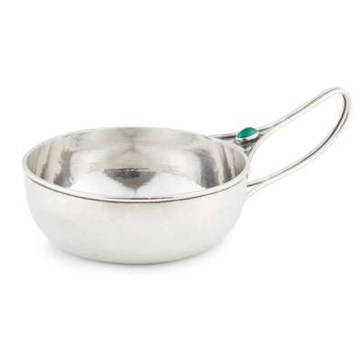 the hand-hammered silver circular bowl with elongated wirework handle, set with a green chrysoprase cabochon, maker’s mark GOFH LTD.