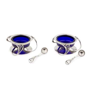 each with blue glass liners, within circular frames with spiral stylised pierced leaf supports on tapering and spreading bases, stamped maker's marks and hallmarks for London 1900, together with the MATCHING SPOONS, unmarked