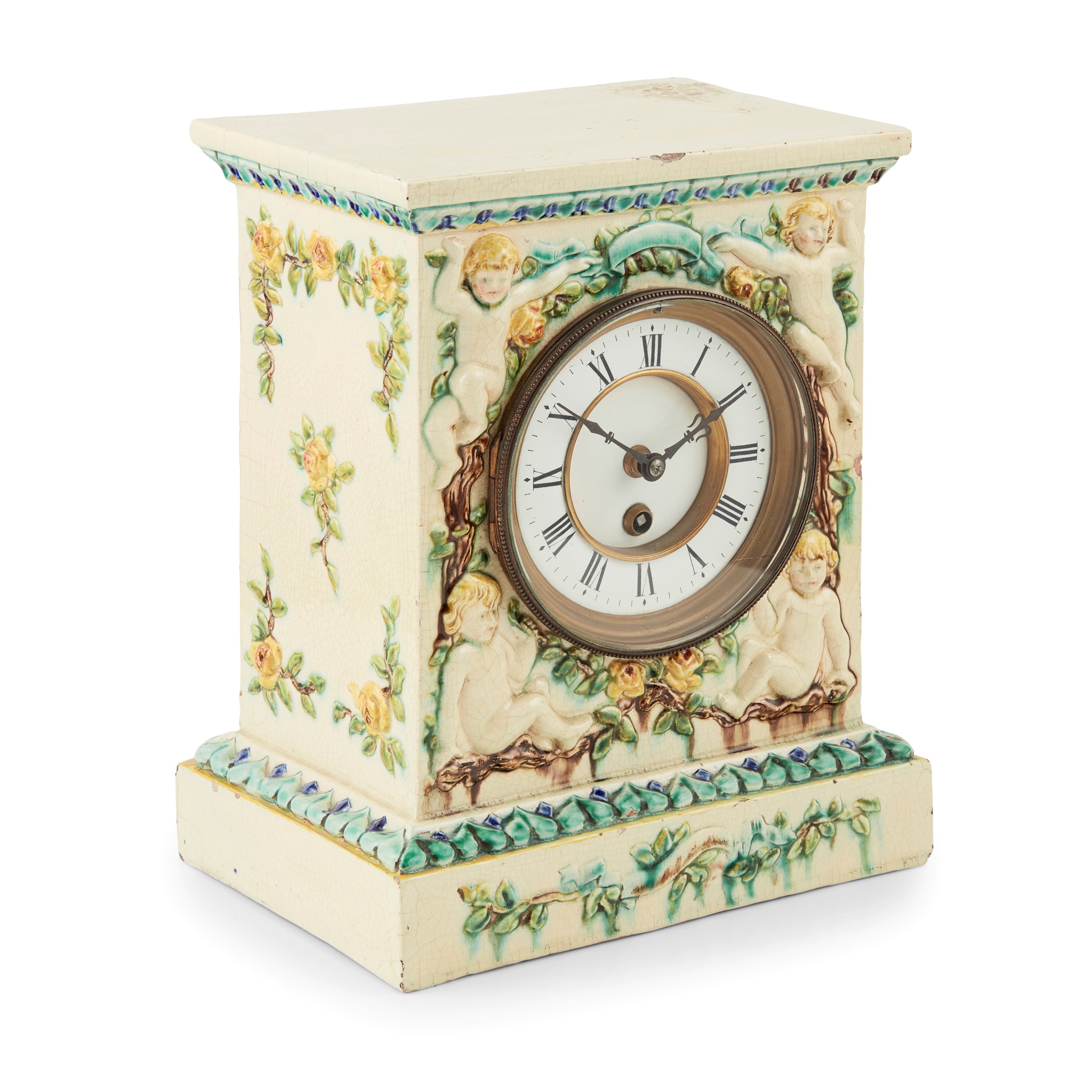 the circular dial with single train movement, within a moulded case with putto amongst foliage