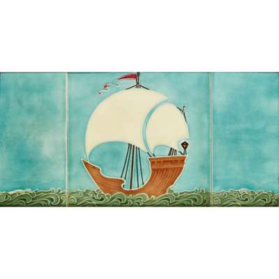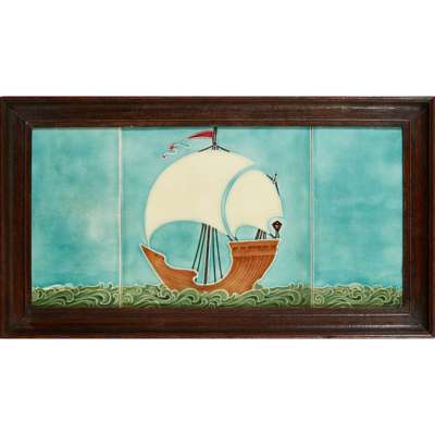 comprising three tiles, depicting a stylised galleon in full sail, framed