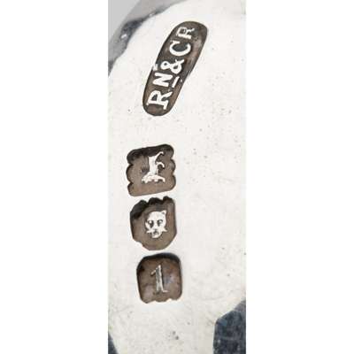 the planished bowl with scroll terminals, set with enamel, stamped maker's marks and hallmarks for London 1906
