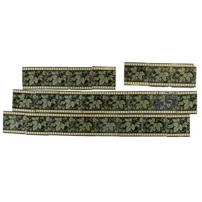 variously marked each tile 15.5cm square approx., together with a large group of MINTON & CO. tiles, decorated with fruiting vines on a black ground within beaded bands, stamped maker's marks MINTONS/ CHINA WORKS/ STOKE ON TRENT, each tile 20.7cm square approx