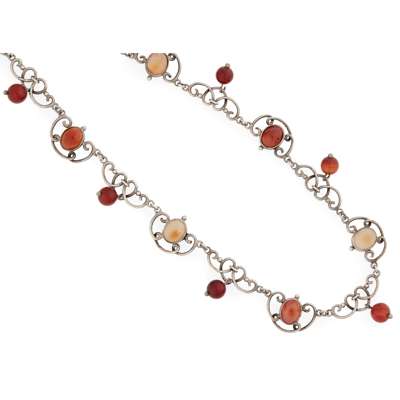 with characteristic entwined silver wirework heart-shaped links, alternately set with oval carnelian and oval pale agates, with carnelian bead drops between, unmarked