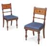 each with dentil top rail and inlaid panel above a close-nailed upholstered seat on turned and blocked legs, with corresponding dentil seat rail