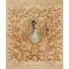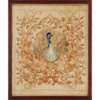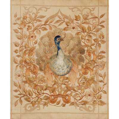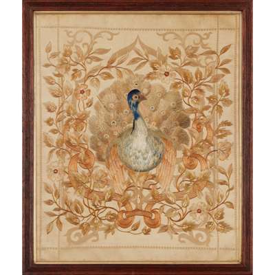 worked in coloured silks and metal threads on a silk damask ground, depicting a peacock amongst foliage