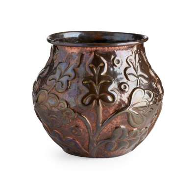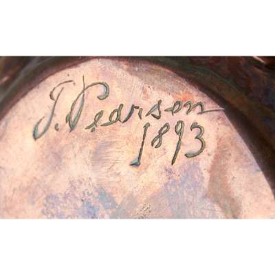 repoussé decorated with stylised leaves and foliage, base signed and dated J. PEARSON/ 1893