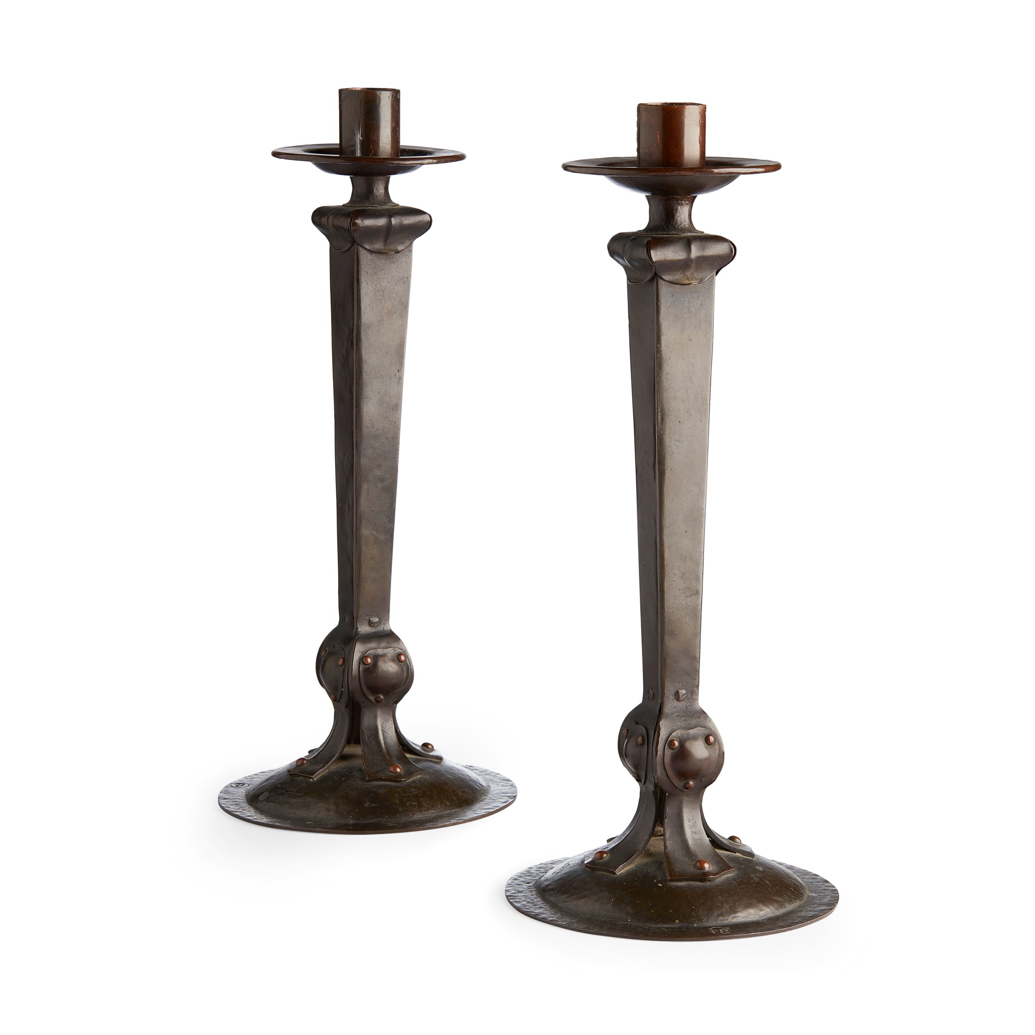 PAIR OF ARTS & CRAFTS PATINATED COPPER CANDLESTICKS, CIRCA 1900