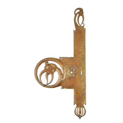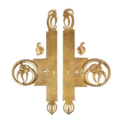 each with hammered finish and cut-out decoration of grotesque beasts, includes two matching door handles
