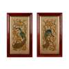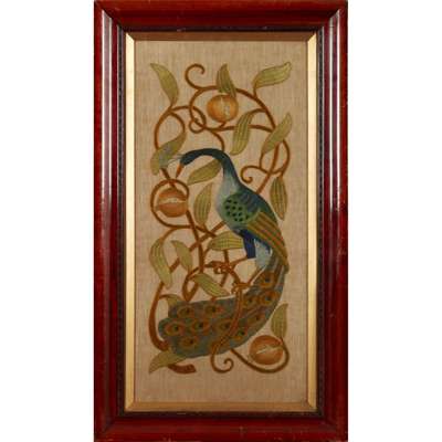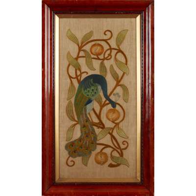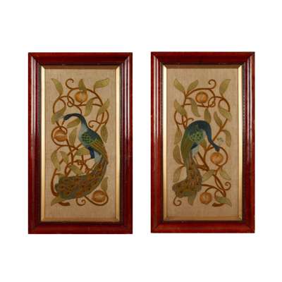 each depicting peacocks on foliate branches, coloured silks on an unbleached linen ground, framed