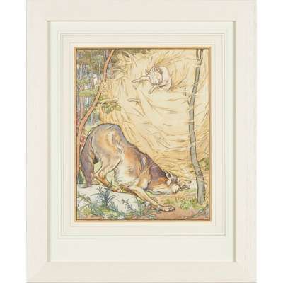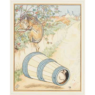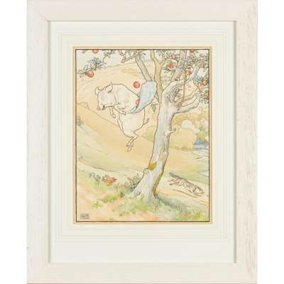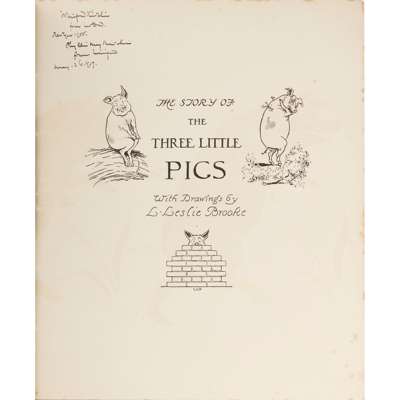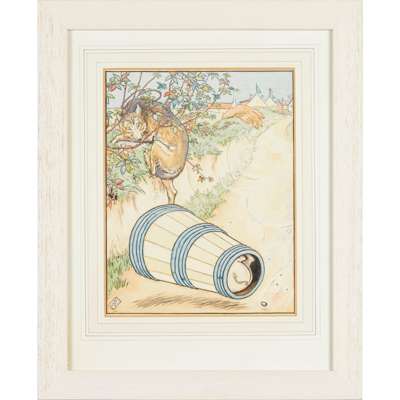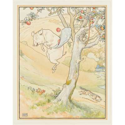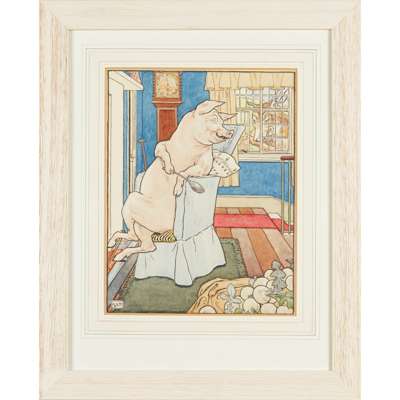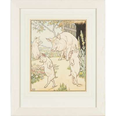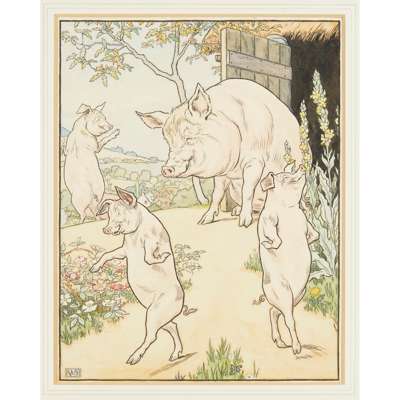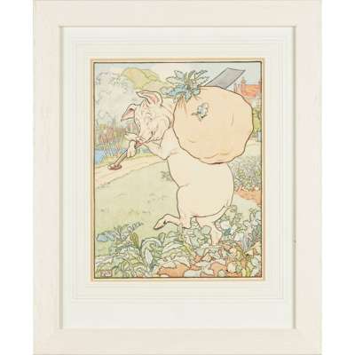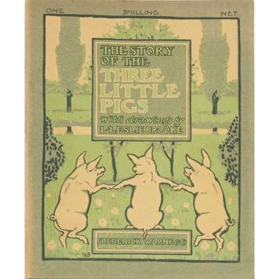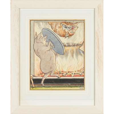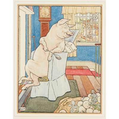Note: Despite formative training as a portrait and landscape painter, Leonard Leslie Brooke is best known as an illustrator, primarily for children’s books. Brooke quickly gained recognition for his work through numerous collaborations with Mrs Molesworth, author of children’s classics such as The Cuckoo Clock and The Carved Lions. In 1899, knowing his talent as an illustrator, Brooke decided to try his hand as a writer and penned the hugely popular novel Johnny Crow’s Garden. Following this success, Brooke moved his family to London and began working on illustrations for various fairy tales and nursery rhymes, of which The Golden Goose and The Three Little Pigs are widely considered his best work. These charming illustrations are characteristic of Brooke’s work: deploying witty visual puns which delight and amuse the audience.