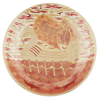decorated with a Viking ship in full sail, bears artist's initials CP