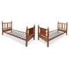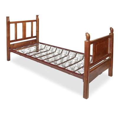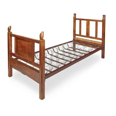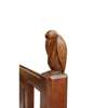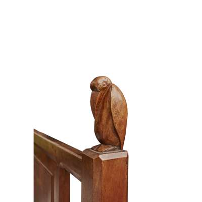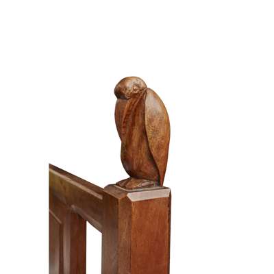the headboards with leaf-carved finials, the footboards with central panel and finials carved as perched birds, each retains sprung base