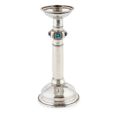 ARTS & CRAFTS WHITE METAL AND ENAMEL ALTAR CANDLESTICK, CIRCA 1900