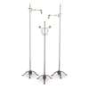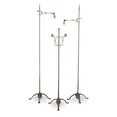 comprising a PAIR OF ADJUSTABLE READING LIGHTS, with scrolling arms and square columns above quadruped bases, 161cm high; and a MATCHING CANDELABRA, with adjustable arms branches on a corresponding tripod base, 121.5cm high
