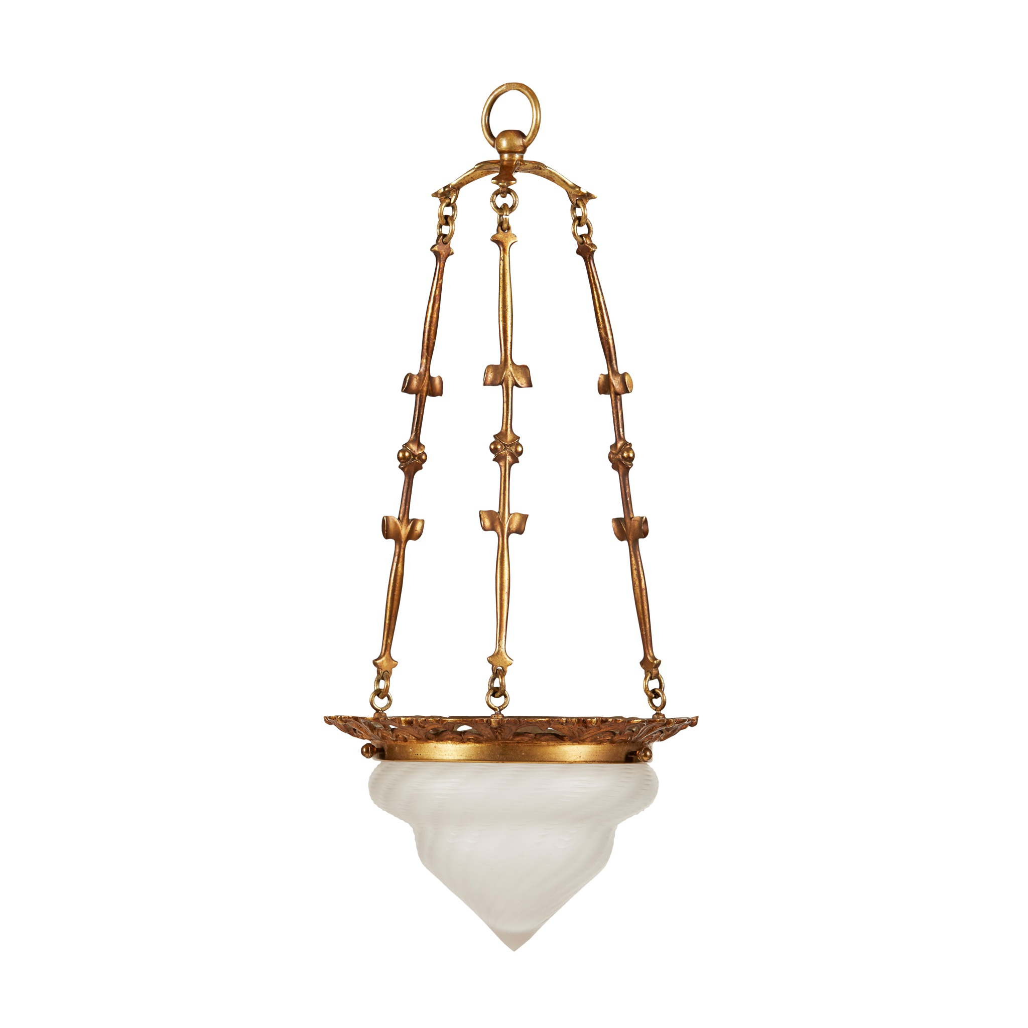 ARTS & CRAFTS BRASS AND FROSTED GLASS PENDANT CEILING LIGHT, CIRCA 1910