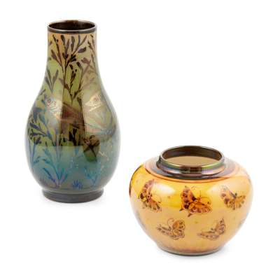 decorated with butterflies, painted artist's and date cyphers to the base, impressed factory monogram and marks 2791/ */ ENGLAND, 8cm high; and a PILKINGTON’S ROYAL LANCASTRIAN LUSTRE VASE, BY RICHARD JOYCE, CIRCA 1920, decorated with swimming pike, painted artist's cypher to the base, impressed factory monogram and marks 2618/ ROYAL LANCASTRIAN/ ENGLAND, 16cm high