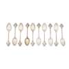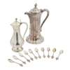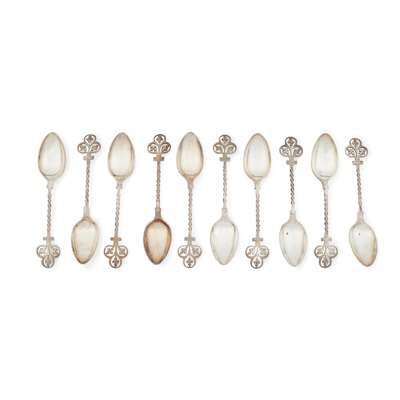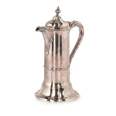 of lobed baluster form, engraved with a central crest, on a spreading circular foot, indistinct maker's marks, hallmarked Birmingham 1861-2, 27cm high; and a MARTIN HALL AND CO. GOTHIC REVIVAL PLATED EWER, the pointed hinged cover with leaf clasped finial, the body of lobed form, spreading base, 31.5cm high; together with a SET OF 10 GOTHIC REVIVAL SILVER TEASPOONS, by Jehoiada Alsop Rhodes, each with writhen handles and leafy trefoil finials, stamped maker's mark, hallmarked Sheffield 1872, date lozenge mark, 12cm long