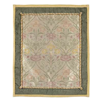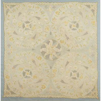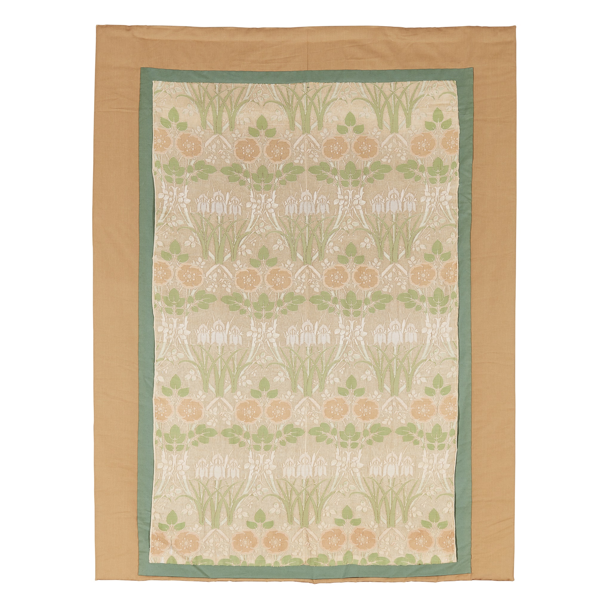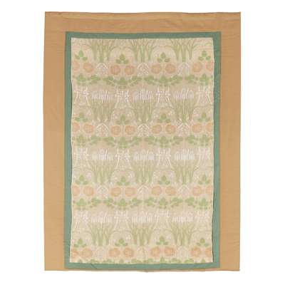 with repeating lattice design of flowering foliage, later chenille and silk borders with rope braiding, 81cm x 68cm; an ARTS & CRAFTS EMBROIDERED SILKWORK TABLECLOTH, worked in coloured silks on a lace and muslin ground with roundels of floral motifs, later mounted on covered board, panel 90cm x 92cm; and an ARTS & CRAFTS 'MADRAS MUSLIN' PANEL ATTRIBUTED TO ALEXANDER MORTON & CO with repeating pattern of lilies and roses, reserved on a later cotton border and quilted backing, 205cm x 121.5cm