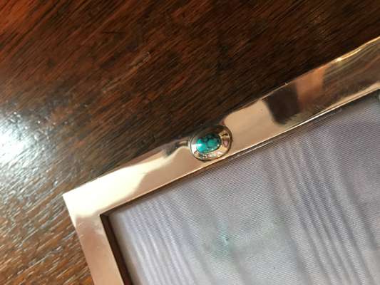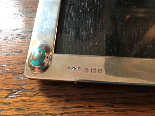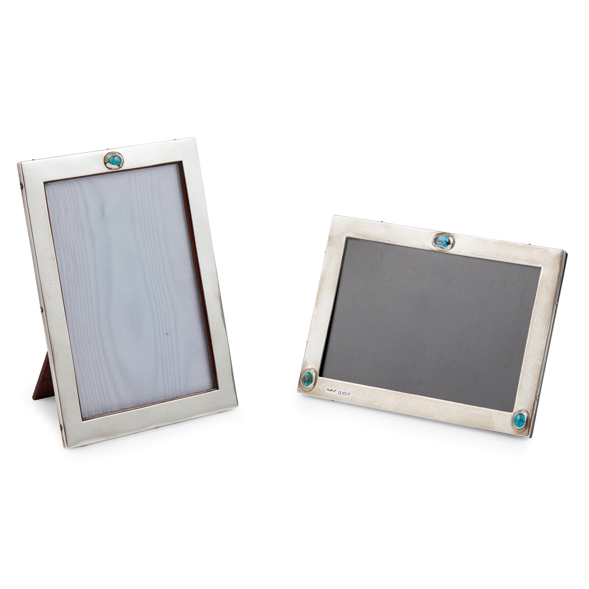 the largest set with one turquoise cabochon, stamped maker's marks and hallmarks for Birmingham 1909, 17.5cm x 13cm; the other set with three turquoise cabochons, stamped maker's marks and hallmarks for Birmingham 1905, 12cm x 16cm