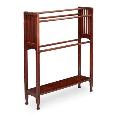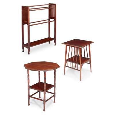 with waved slatted sides, 44.5cm across, 66cm high; and AESTHETIC MOVEMENT MAHOGANY OCCASIONAL TABLE, with octagonal top on ring-turned legs, 54cm across, 63.5cm high, together with a TOWEL RAIL, 76.5cm wide, 91.5cm high, 20cm deep