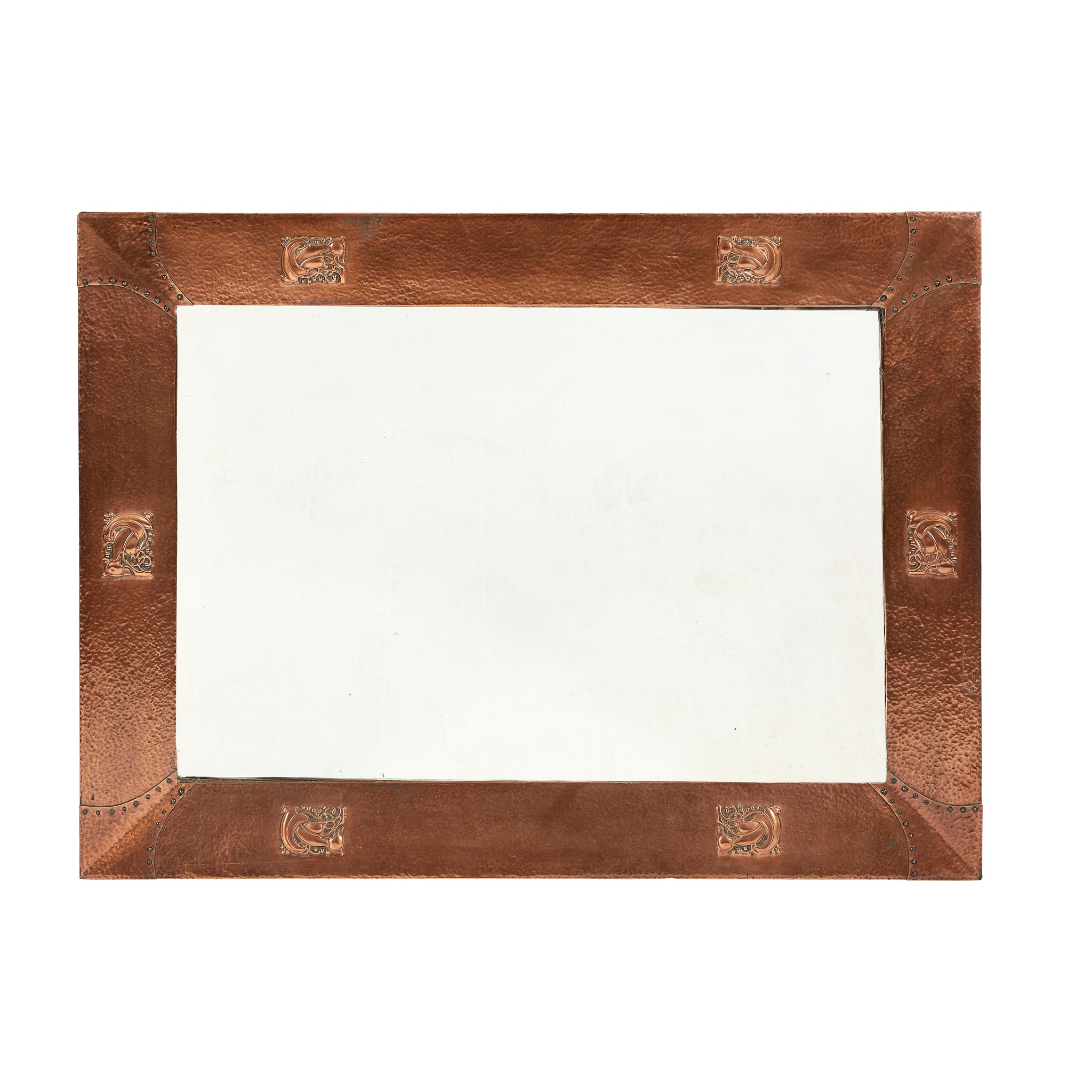 the rectangular bevelled plate enclosed by riveted copper frame with hammered finish and embossed leaf and berry motifs