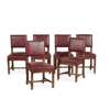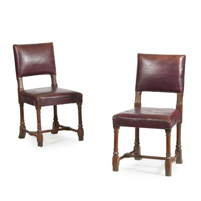 each with chamfered decoration, the upholstered back and seat on square legs linked by stretchers, 47cm wide, 90cm high, 44cm de; and a PAIR OF GOTHIC REVIVAL OAK DINING CHAIRS, each with leather upholstery and raised on facetted turned and blocked legs, united by stretchers, 48cm wide, 92cm high, 48cm deep