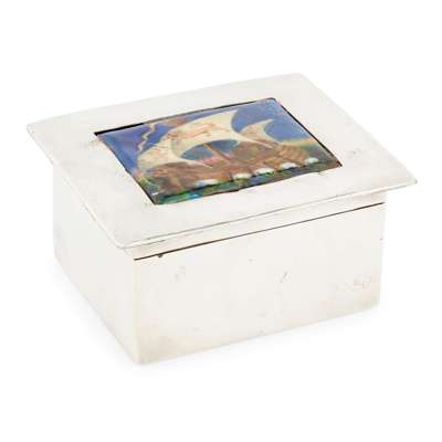 of square form, the lid set with an enamelled panel depicting a galleon in full sail, stamped maker's marks TUDRIC 0544