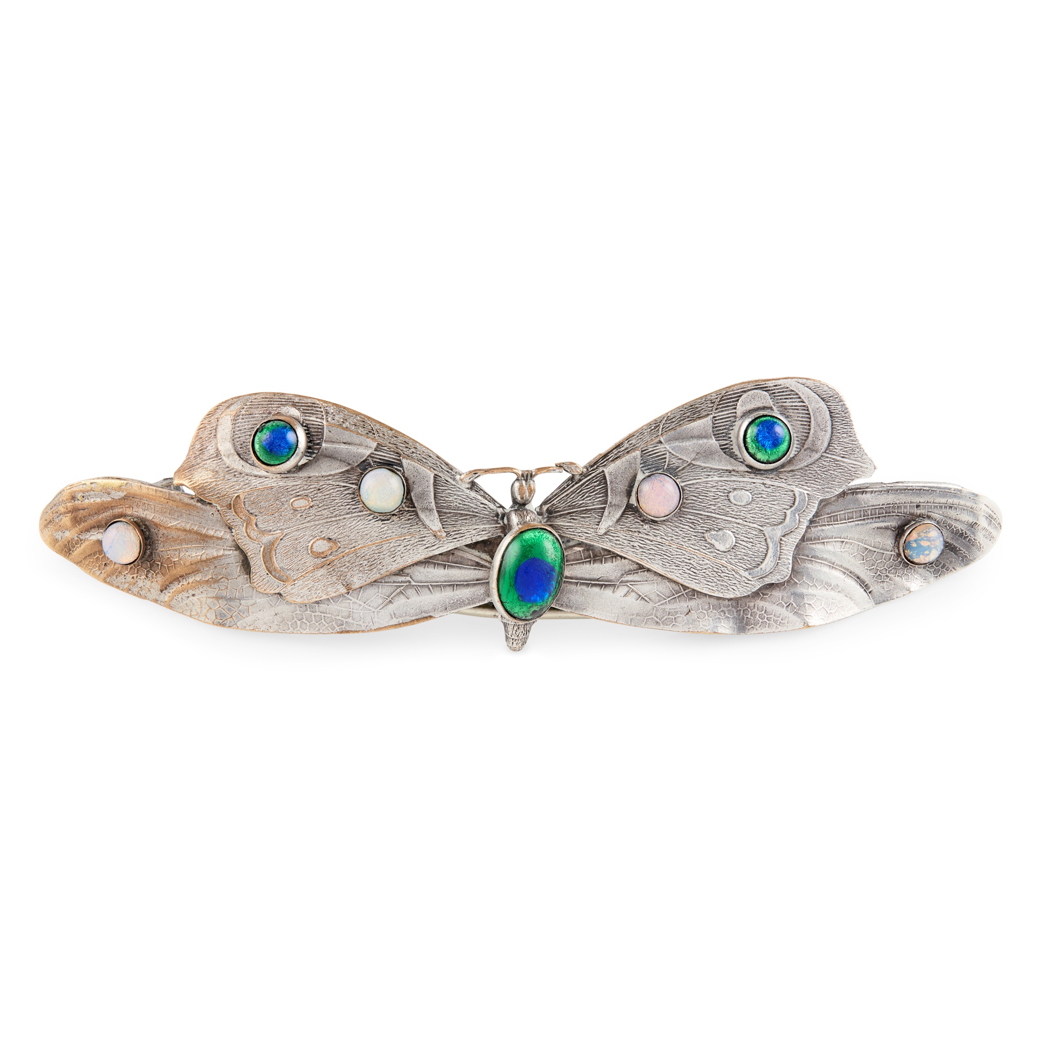 cast as a butterfly with textured outstretched wings, set with paste opal and ‘peacock’s eye’ cabochons, the reverse inscribed, E. THOMPSON, 45 DUDLEY DRIVE