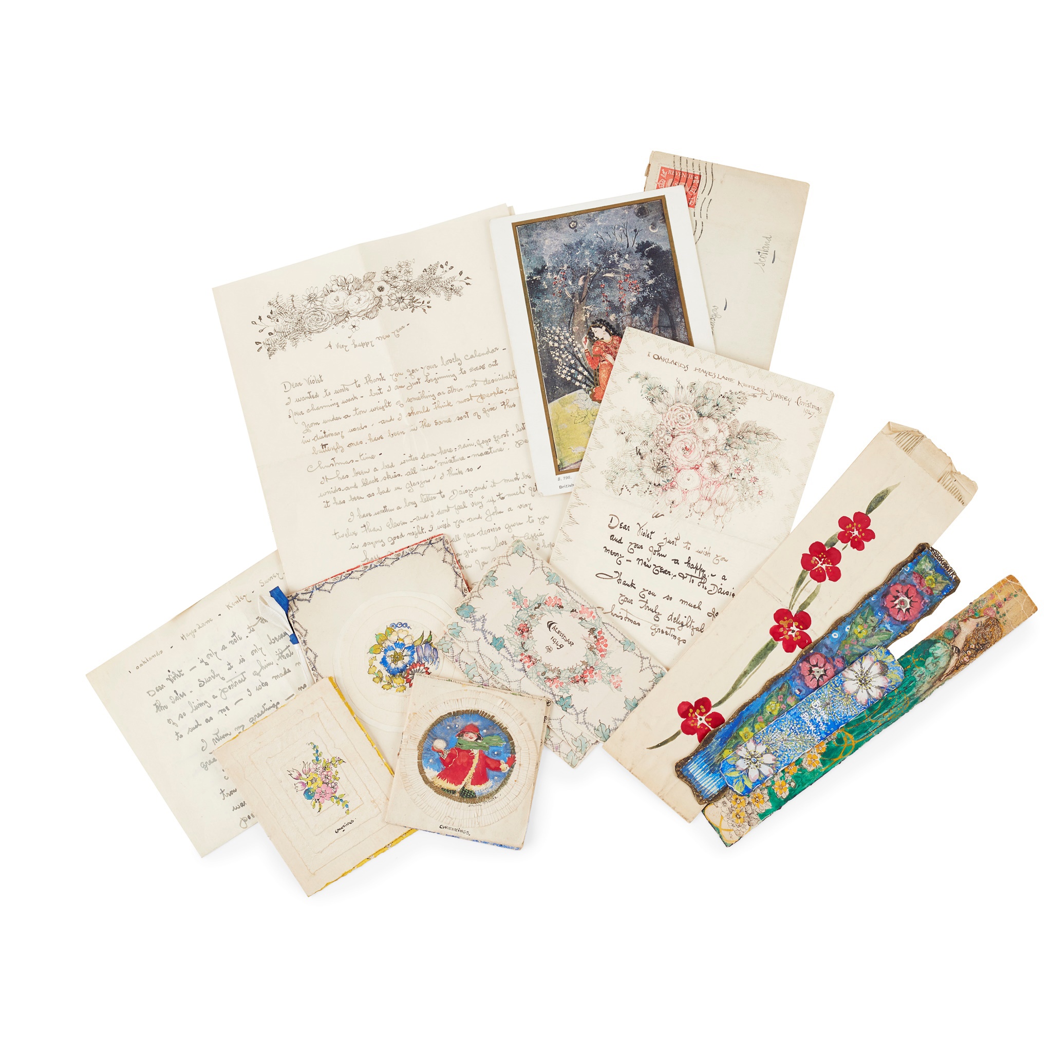 the bookmark depicting a Glasgow-style girl in a green dress, with delicately painted flowers drawn in black ink and watercolour; two further painted bookmarks; two calendars; two New Year cards; three hand-written letters and a postcard from Annie French, addressed from Oaklands, Hayes Lane, Kenley, Surrey to Violet Neish, including two with floral embellishments; and three other hand-painted floral designs