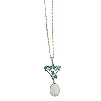 with six flower heads highlighted in turquoise/green enamel with delicate silver tendrils and berries between, suspending an oval blister pearl drop, on silver neck chain