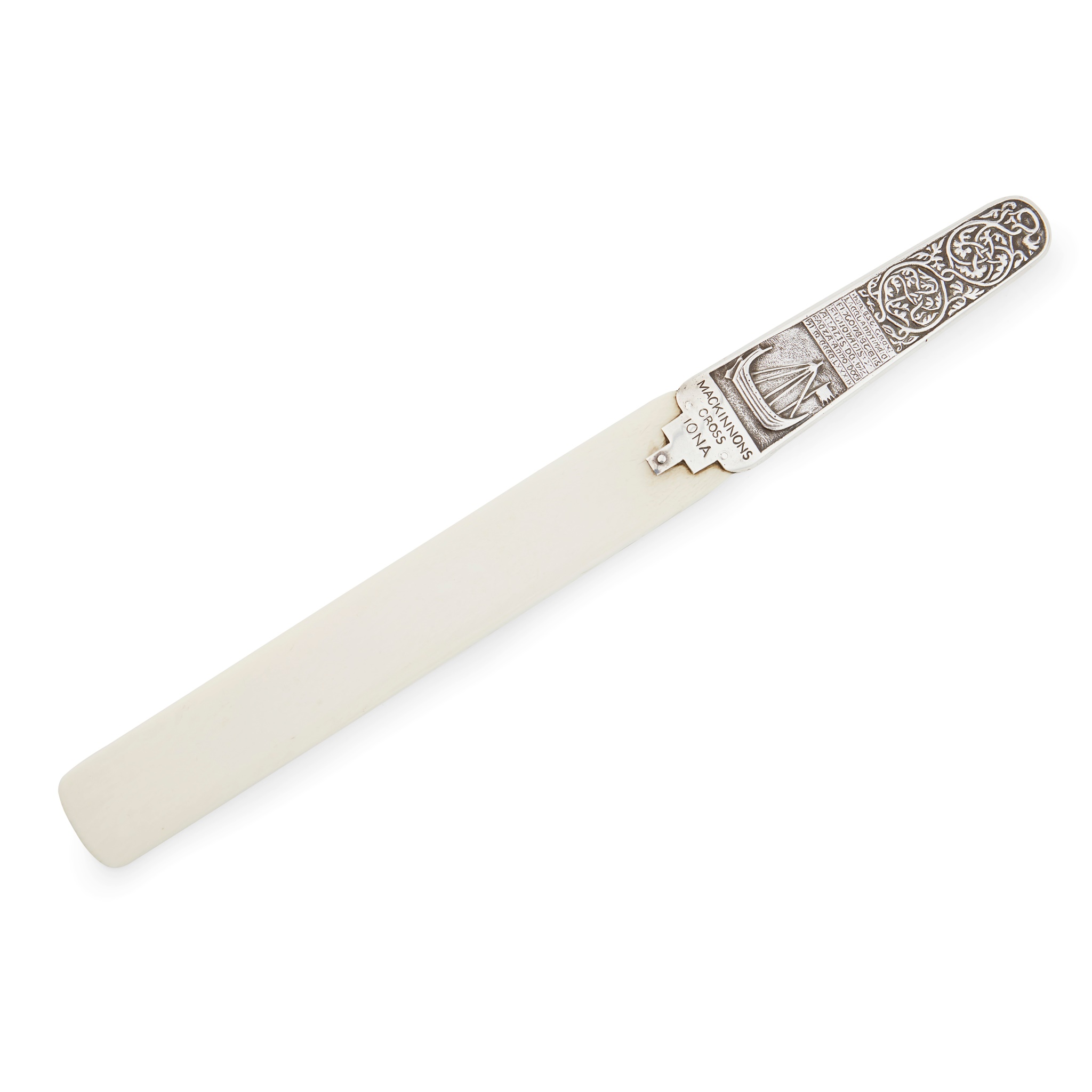 the ivory opener with handle cast with scrolling foliate motifs, longboat and Griffin devices and cast inscription, further inscribed MACKINNONS CROSS/ IONA, bears makers marks for George & John Morgan, hallmarked Glasgow 1927
