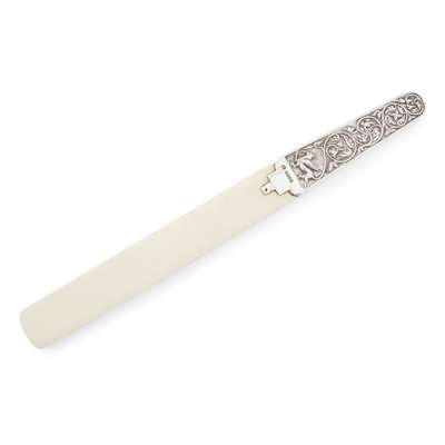 Note: One side of the handle of this letter-opener bears the design of an Iona cross shaft, set up in 1489 by Abbott John Mackinnon and his father Lachlan, chief of the clan and the reverse mirrors the cross back, with long plant-scroll emanating from the tail of a griffin, a commonly occurring motif in Ritchie's work.