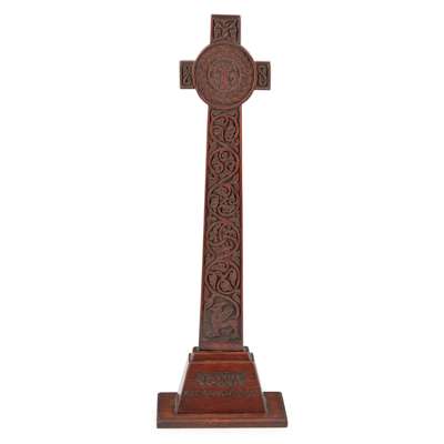 carved and stained oak, bears inscription to base IONA/ MACKINNON'S CROSS, incised makers marks to base AR/ IONA/ 1900