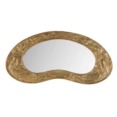 the shaped and bevelled mirror plate enclosed by a repoussé frame decorated with birds perching on branches