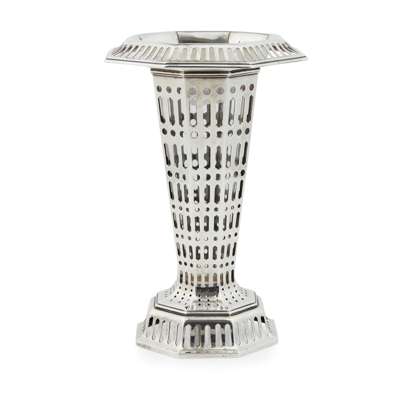 with an everted octagonal neck later engraved 1881/ D/ 1906, above a tapered panelled column with a glass insert and corresponding base, stamped TIFFANY & CO./ 15703/ MAKERS/ 6443/ STERLING SILVER/ 925, with draw-string bag
