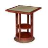 the square top inset with woven silk panel, raised on four rectangular supports pierced with brass capped columns, linked by two circular tiers, the whole raised on a tapering brass base