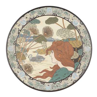 depicting an Art Nouveau maiden gazing across a river scene, enclosed by a circular frieze of stylised foliage, painted signature R.THÉVENI, impressed maker's marks METTLACH 2542