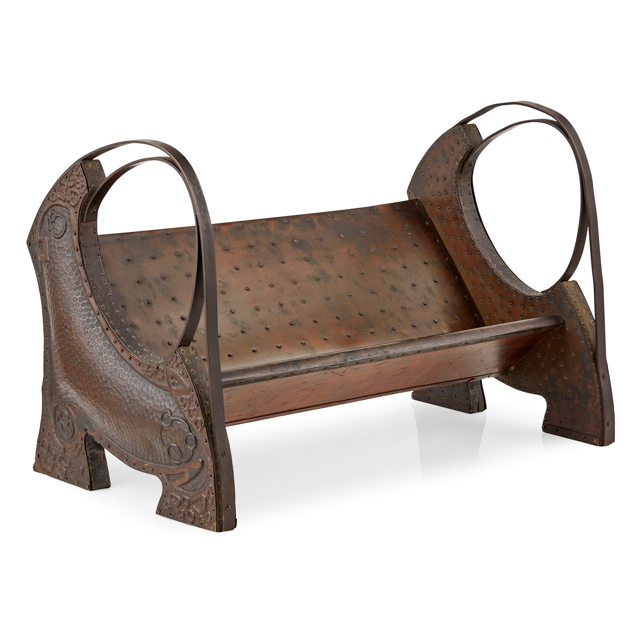 the repoussé-decorated end panels linked by an angled copper lined shelf