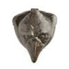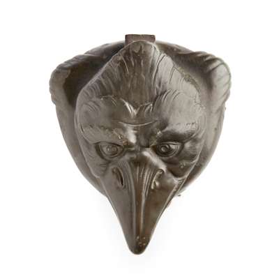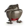 cast as a grotesque bird, with hinged lid enclosing ceramic liner, the body of maroon glazed earthenware, engraved to base of foot H 3