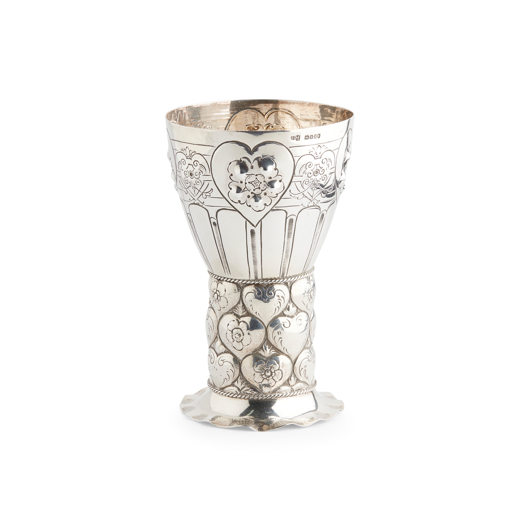 the bowl with chased and engraved rosettes and hearts, the stem with corresponding design in relief, on a frilled foot, stamped marks to base and London import hallmarks 1897