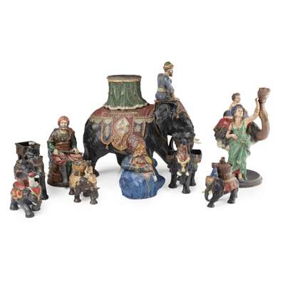 Lidded elephant, S&F/1090/15.5cm high; Elephant basket, FGW/066, 21cm high; Elephant monkey, W&C/1090, 16cm high; Elephant with bowl, 550, 15cm high; Larger elephant with bowl, unmarked, 22cm high; Seated man, HN/19, 28cm high; Sultan, Dep/336 indistinct, 22cm high; Ostrich, G&ST/1805, 38cm high; Large elephant, FGW/880, 43cm high (missing cover)