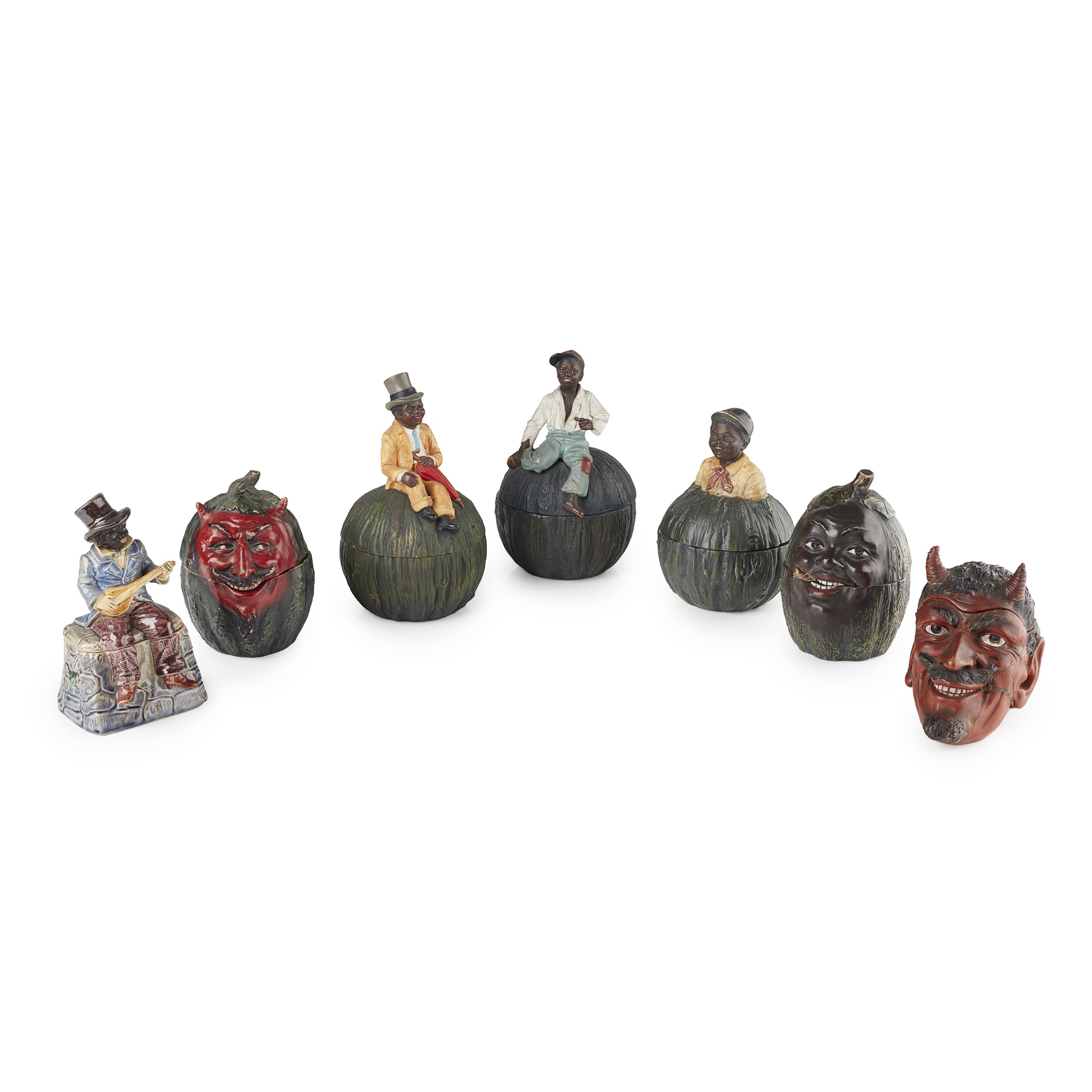 comprising three figures seated on melons, comprising one wearing a derby hat, impressed marks ‘JM/ 3457’, 19cm high; one wearing a top hat, impressed marks ‘JM/ 3455’, 23cm high; and one in a red cap holding a pipe, impressed marks ‘JM/ 3350’, 23cm high; together with three jars modelled as diabolic transitions, comprising a devil’s face with a melon body, impressed marks ‘JM/ 3529’, 15cm high; a man’s head with a cigar on a melon, impressed marks ‘8263’, 16.5cm high; and a further modelled as a devil, impressed marks ‘JM/ 3341’, further jar modelled as a musician sitting atop a wall, impressed marks ‘BU/ 857’, 18cm high