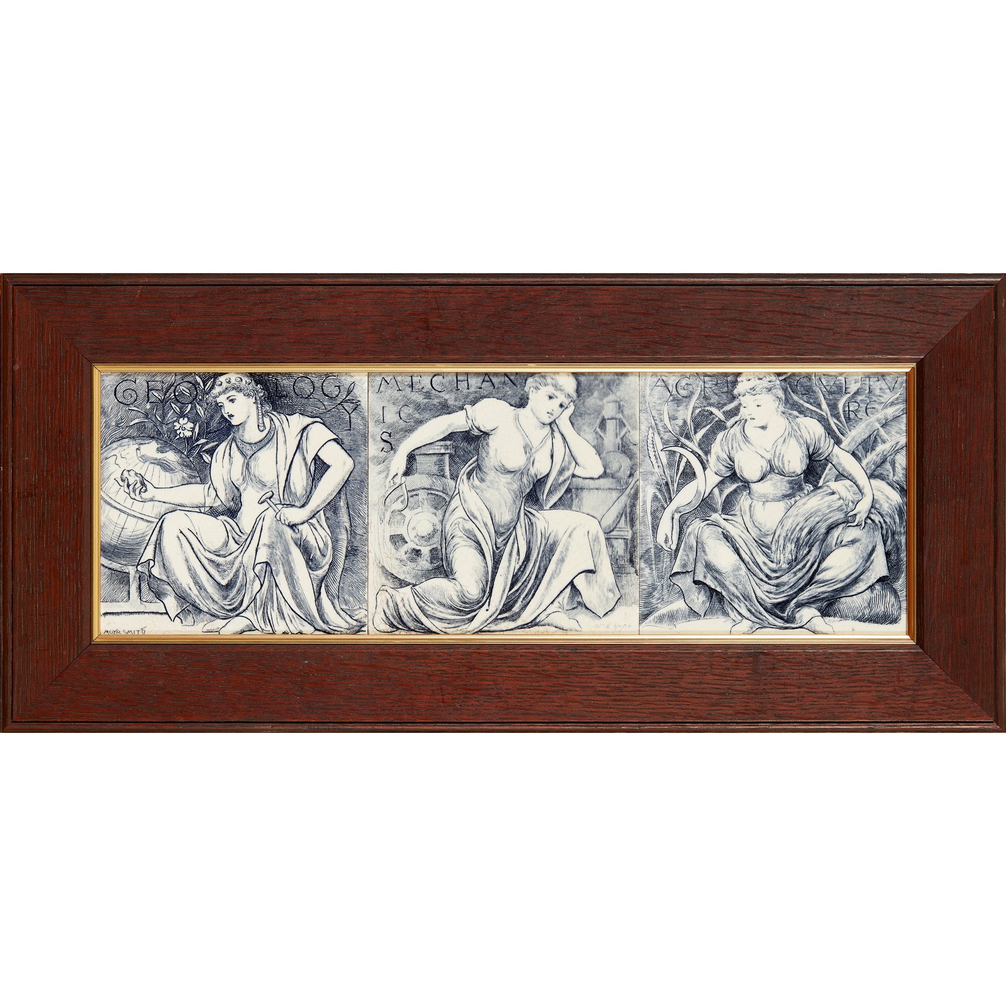 comprising three tiles, each depicting female figures as GEOLOGY, MECHANICS and AGRICULTURE, signed MOYR SMITH, in an oak frame