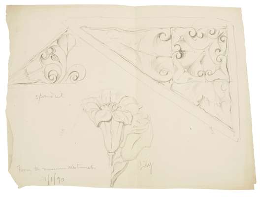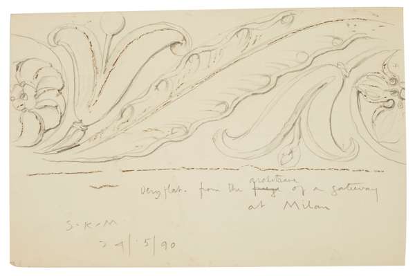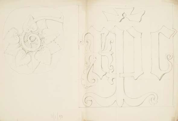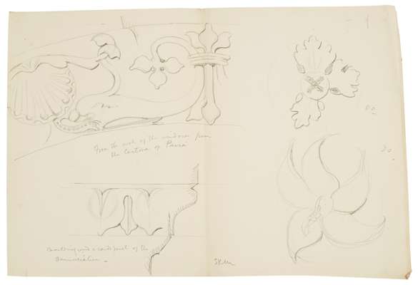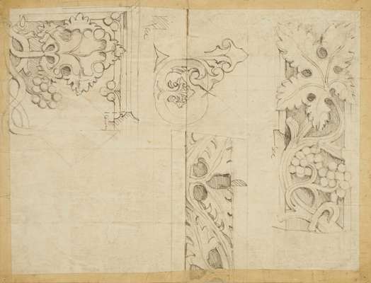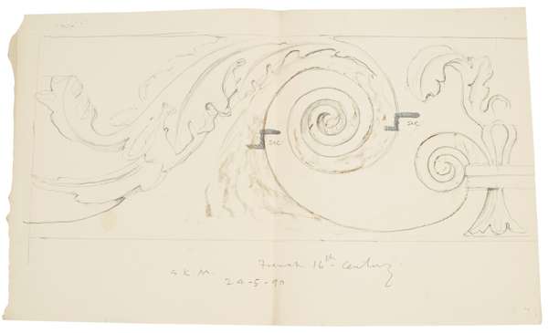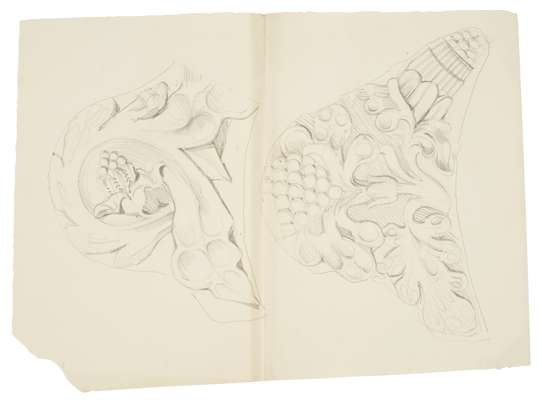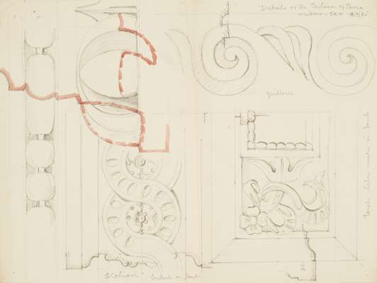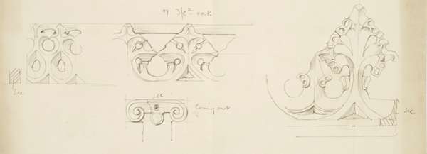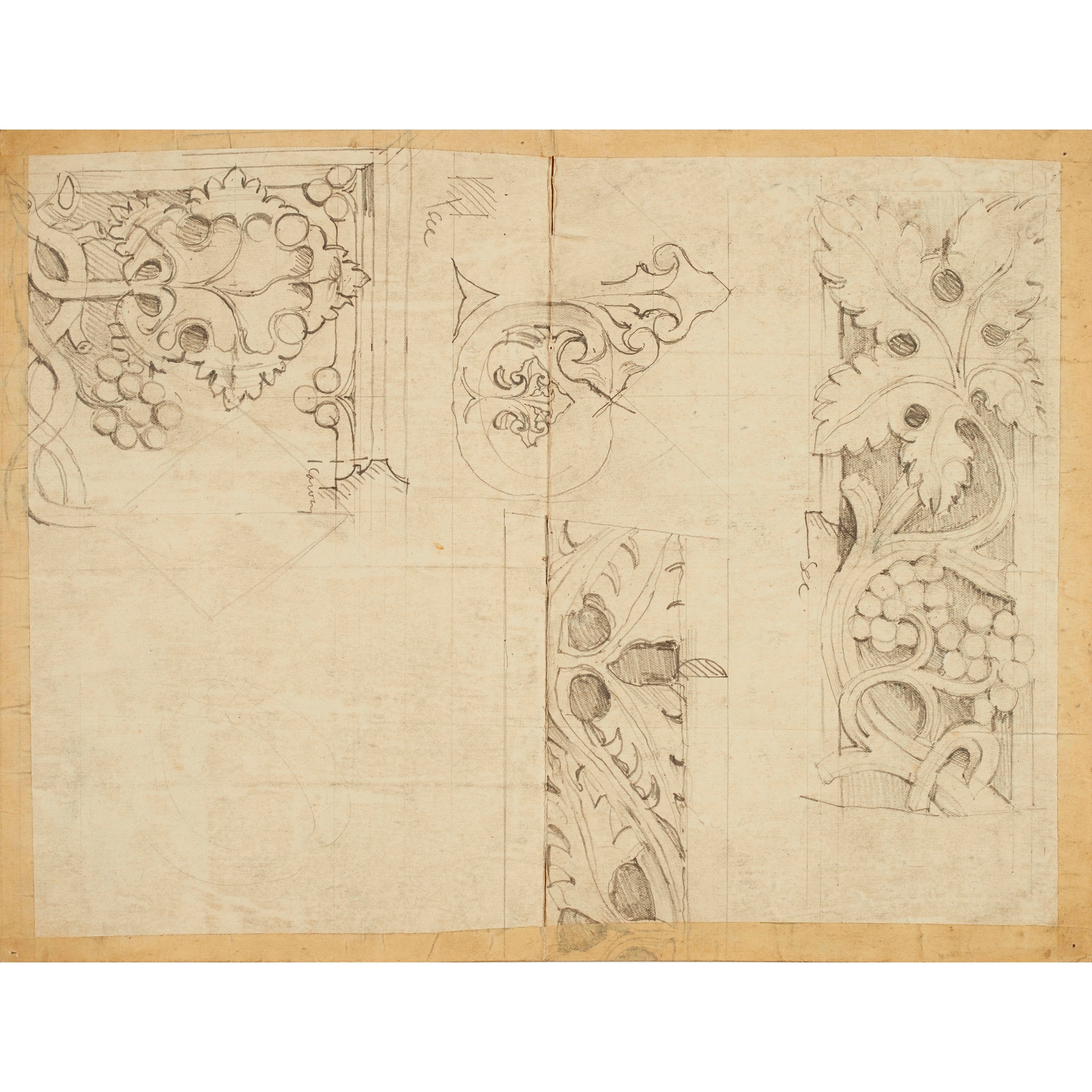 to include TWO DRAWINGS OF PILASTER DETAILS FROM THE HOTEL DE VILLE, PARIS, pencil on linen back paper, one with photograph, 4179cm x 32cm and 159cm x 29.5cm; a DESIGN FOR AN ALTAR FOR THE CHURCH OF THE GOOD SHEPHERD, EDINBURGH, 45cm x 35cm; and FORTY-ONE FURTHER DRAWINGS IN PENCIL, depicting various architectural and plasterwork details in France, Milan and Westminster (measurements and images of all items available on request or see our website www.lyonandturnbull.com)